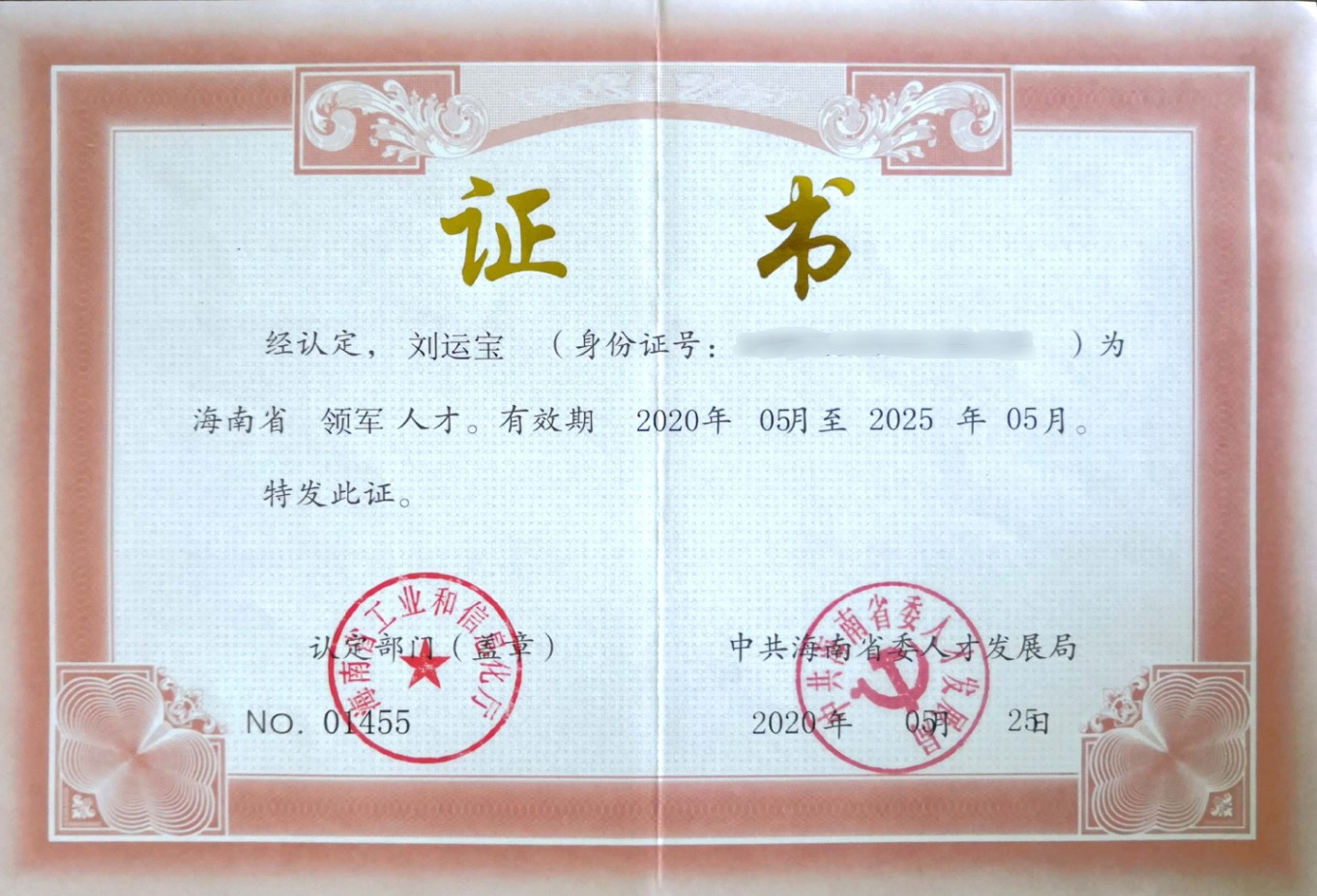 2020年5月,公司總經(jīng)理劉運寶被評為海南領軍人才。海南領軍人才是海南省委省政府、海南省人力資源保障廳等部門為建設海南自由貿(mào)易區(qū)(港)引進的一類高層次人才。