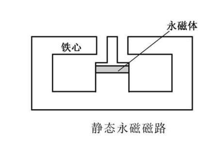 永磁磁路按永磁體的工作狀態(tài)不同可分為靜態(tài)永磁磁路和動態(tài)永磁磁路。靜態(tài)永磁磁路有固定氣隙,工作狀態(tài)保持一定,主要存在于儀表、揚聲器等,圖為一靜態(tài)永磁磁路。動態(tài)永磁磁路的磁阻或外磁場處于變化之中,永磁體的工作點也隨之變化,永磁電機的磁路就是典型的動態(tài)永磁磁路。