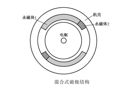 根據(jù)電機中永磁材料種類的多少,可分為單一式結(jié)構(gòu)和混合式結(jié)構(gòu)。在一臺電機中,只采用一種永磁材料,稱為單一式結(jié)構(gòu),絕大多數(shù)電機都采用該種結(jié)構(gòu)。若同一臺電機中采用兩種或兩種以上永磁材料,則稱為混合式結(jié)構(gòu)。混合式結(jié)構(gòu)通常采用兩種性能特點不同的永磁體,揚長避短,充分發(fā)揮永磁材料的優(yōu)勢,提高電機的性能,降低制造成本。如下圖為永磁直流電動機中的混合式磁極結(jié)構(gòu),將矯頑力低的永磁體1(如鐵氧體)置于磁極的前部,將矯頑力高的永磁體2(如釹鐵硼)置于磁極的后部。