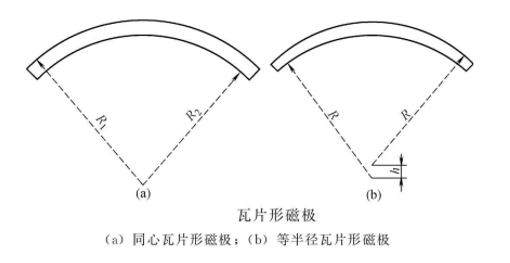 在永磁電機中,瓦片形磁極應用廣泛。瓦片形磁極通常有同心瓦片形磁極和等半徑瓦片形磁極兩種,如下圖所示。由于燒結(jié)釹鐵硼材料的毛坯為長方體,一般采用線切割方法加工,同心瓦片形磁極的材料利用率較低,一般為40%~50%。采用等半徑瓦片形磁極結(jié)構(gòu),既可提高材料利用率,又可降低線切割加工費用,永磁體材料利用率可提高到80%。
