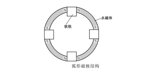 弧形磁極構(gòu)成的磁路系統(tǒng)如下圖所示。這種磁極為圓弧形,沿著圓弧方向充磁,其特點是每極的磁通由兩塊永磁體并聯(lián)提供,充磁方向長度大,適合于鋁鎳鈷永磁。