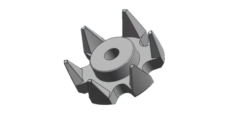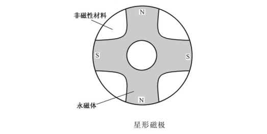 星形磁極結(jié)構(gòu)如下圖所示,結(jié)構(gòu)比較復雜,采用直接澆鑄的方法,極間部分采用非磁性材料(如鋁合金)澆鑄,可以提高其強度并具有阻尼作用。其優(yōu)點是制造和裝配工藝簡單,但充磁困難,磁化不均勻。