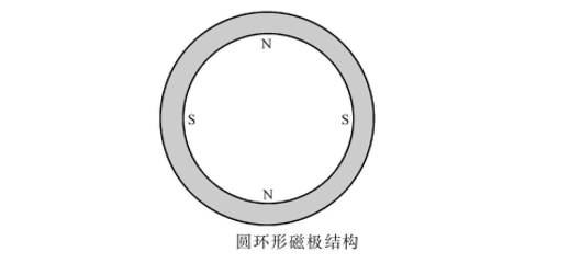環(huán)形磁極如下圖所示,為一整體的圓環(huán),具有結(jié)構(gòu)簡單、加工和裝配方便等優(yōu)點,在永磁直流電機中應用廣泛。其主要缺點是材料利用率低,在幾何中性線上存在磁場,不利于永磁直流電機的換向。