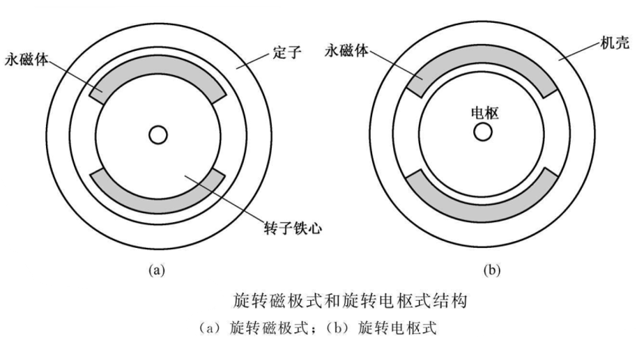 按永磁體所在的位置不同,可分為旋轉(zhuǎn)磁極式和旋轉(zhuǎn)電樞式。圖(a)為旋轉(zhuǎn)磁極式磁路結(jié)構(gòu),永磁體在轉(zhuǎn)子上,電樞是靜止的,永磁同步電動機、無刷直流電動機都采用該種結(jié)構(gòu);圖(b)為旋轉(zhuǎn)電機區(qū)式磁路結(jié)構(gòu),其永磁體在定子上,電樞旋轉(zhuǎn),永磁直流電機采用該種結(jié)構(gòu)。
