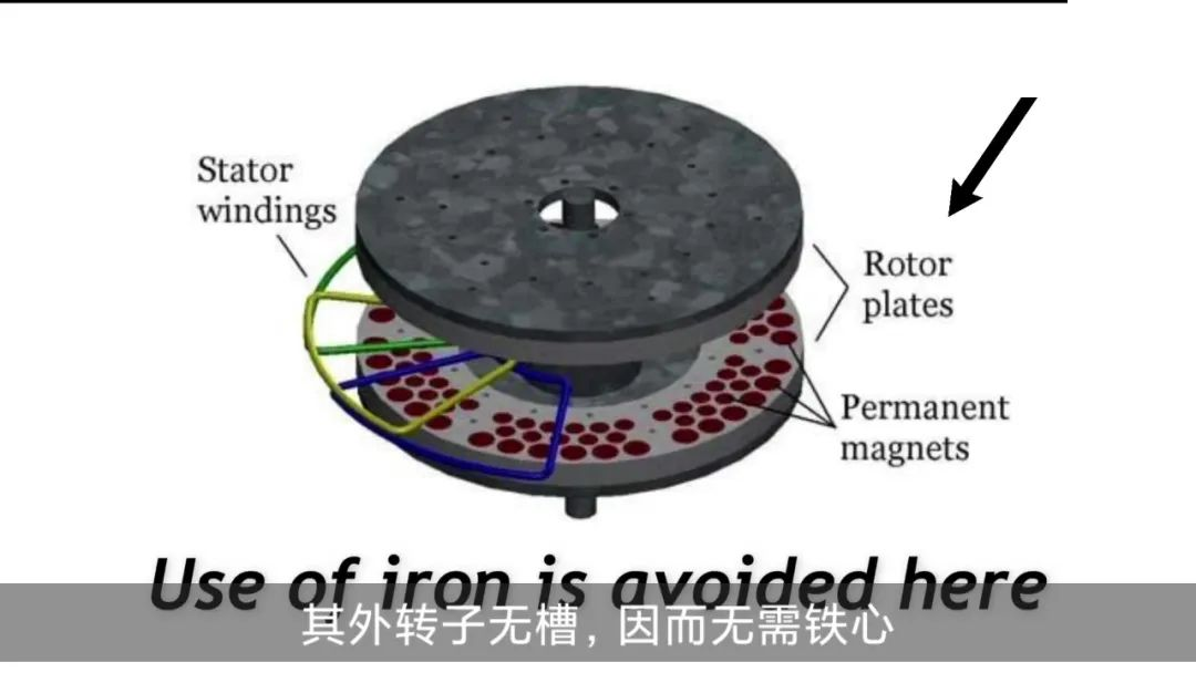 軸向磁通無鐵心永磁電機是當前先進的電動汽車用電機。其外轉子無槽,因而無需鐵心。 它也無定子鐵心,因而重量輕。氣隙磁場的徑向分量提供了更高的功率密度。這種電機的轉子可裝在車輪側,定子繞組放在軸上。無槽設計令其銅損少,效率高,可用空間多。雷諾Coupe就采用了這種電機。
